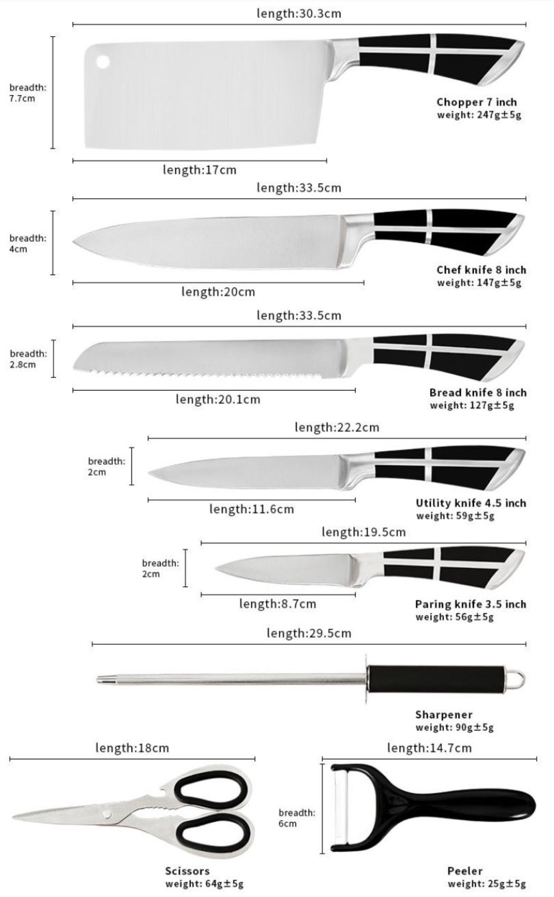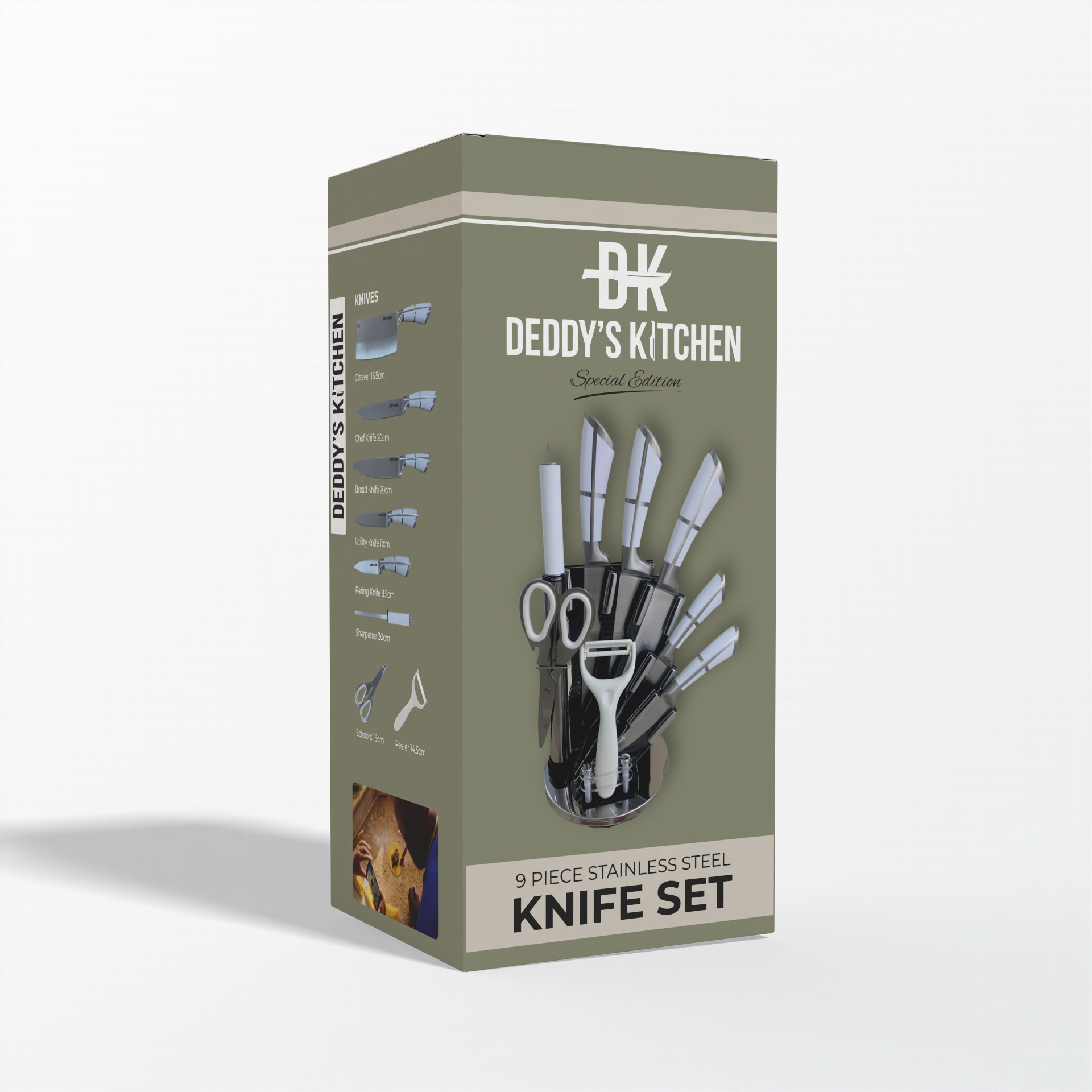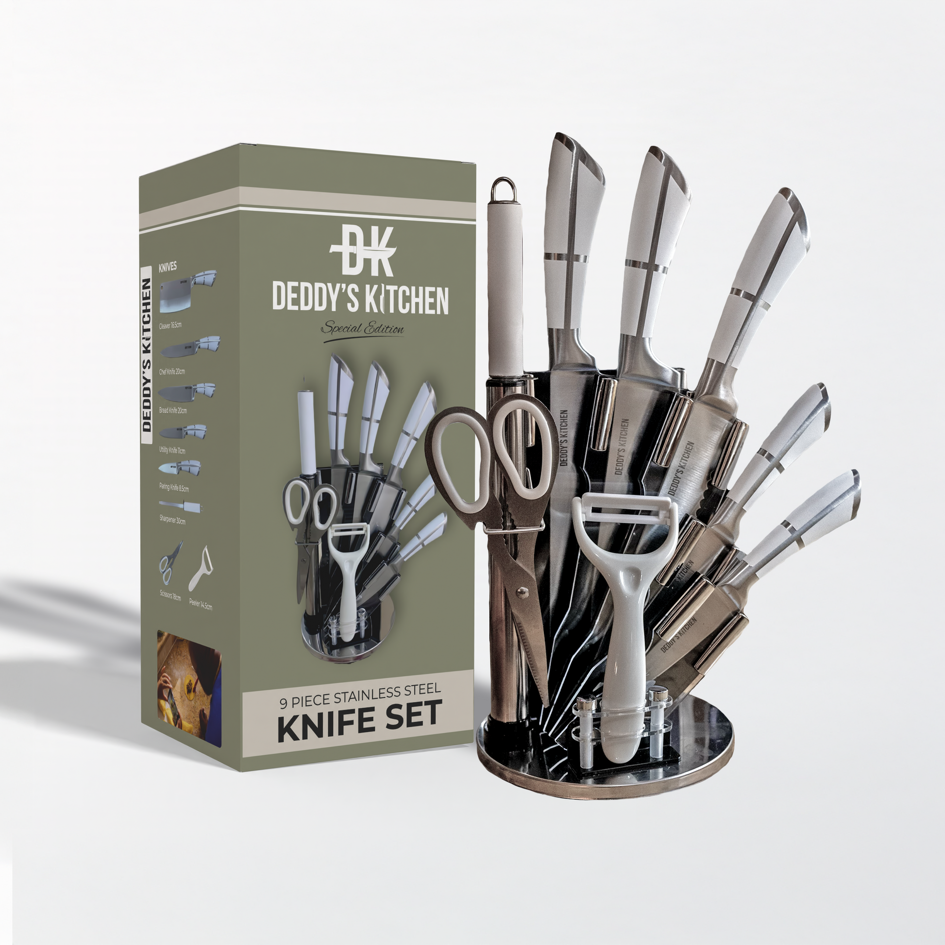 Deddy's stainless steel knife set comes complete with 5 smart grip, professional-grade knives, an at-home sharpener, kitchen shears and peeler. Conveniently placed in a 360 degree rotating acrylic knife block, this set is equipped with everything a seasoned or new cook needs to throw down!